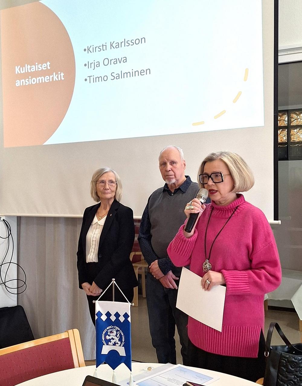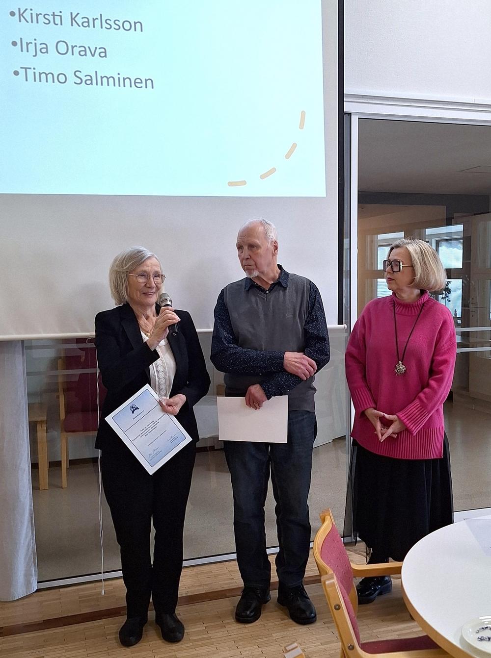 Yhdistyksemme vietti juhlapäivää, kun Kansallisen senioriliiton toiminnanjohtaja Maarit Kuikka luovutti liiton kultaiset ansiomerkit kahdelle yhdistyksemme ansioituneelle jäsenelle, Kirsti Karlssonille ja Timo Salmiselle. Kultainen ansiomerkki on myönnetty myös Irja Oravalle, mutta hän ei päässyt paikalle - merkki luovutetaan hänelle myöhemmin. Senioriliiton kultaisen ansiomerkin myöntämisperusteena on mm. merkittävä toiminta piiri- tai yhdistystasolla tai liiton tarkoitusperiä edistävä osallistuminen yhteisölliseen toimintaan. Uudenmaan kansallinen senioripiiri on puoltanut ansiomerkkihakemukset.